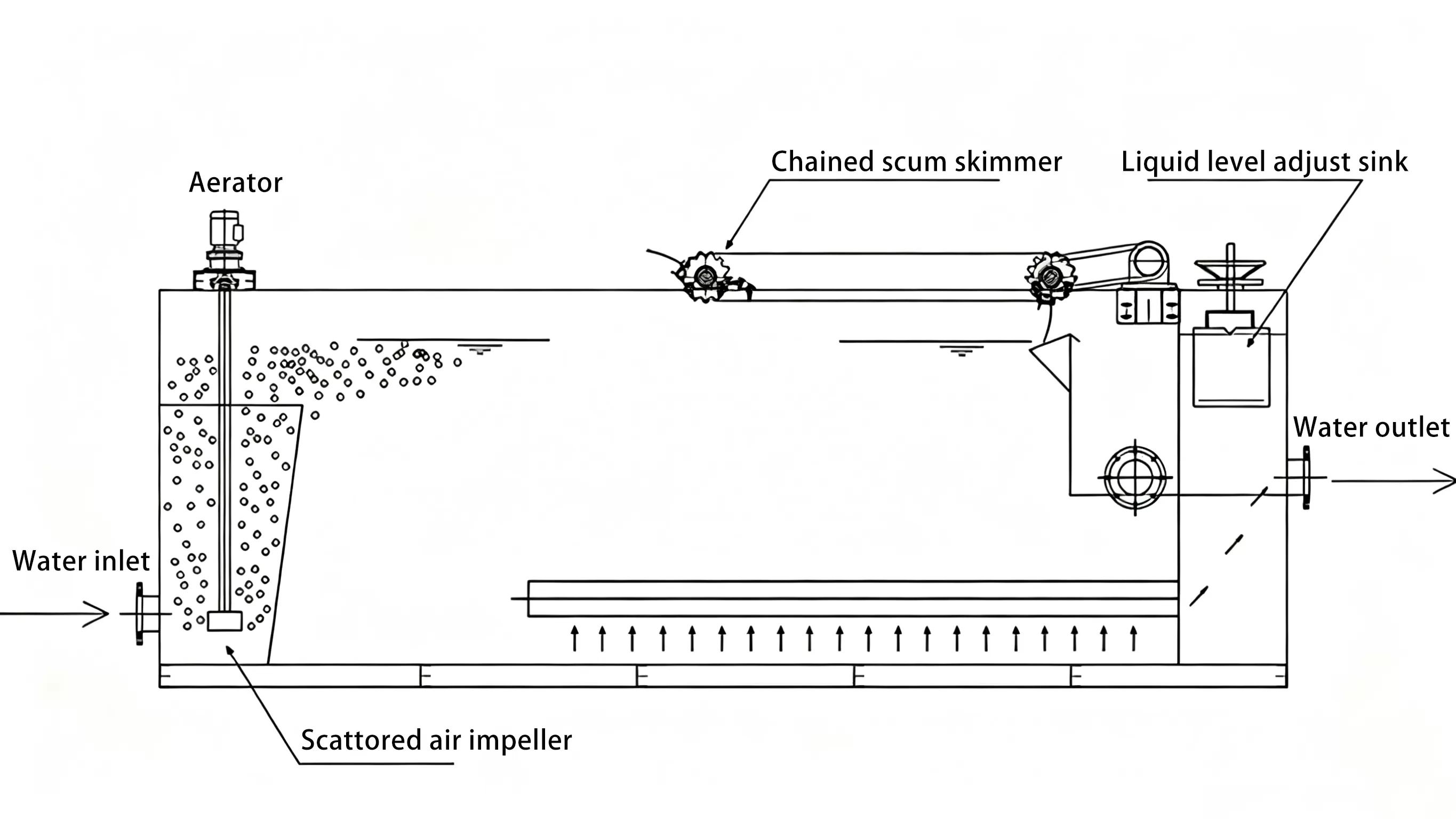 Water Inlet: Raw wastewater (with suspended solids) is pumped into the flotation tank, and coagulants/flocculants are added to form larger flocs.