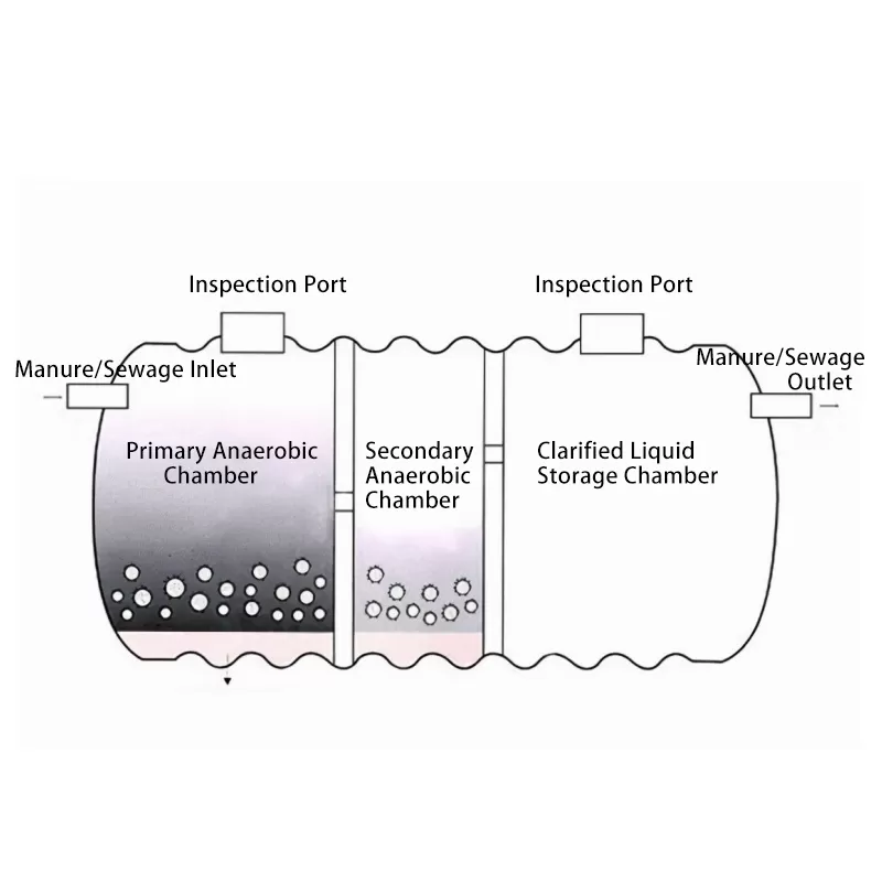 Wastewater undergoes three-step treatment. The first chamber settles 60%-70% solids. The second uses anaerobic bacteria to decompose organics. The third clarifies water, ensuring it meets basic discharge standards for irrigation or release.