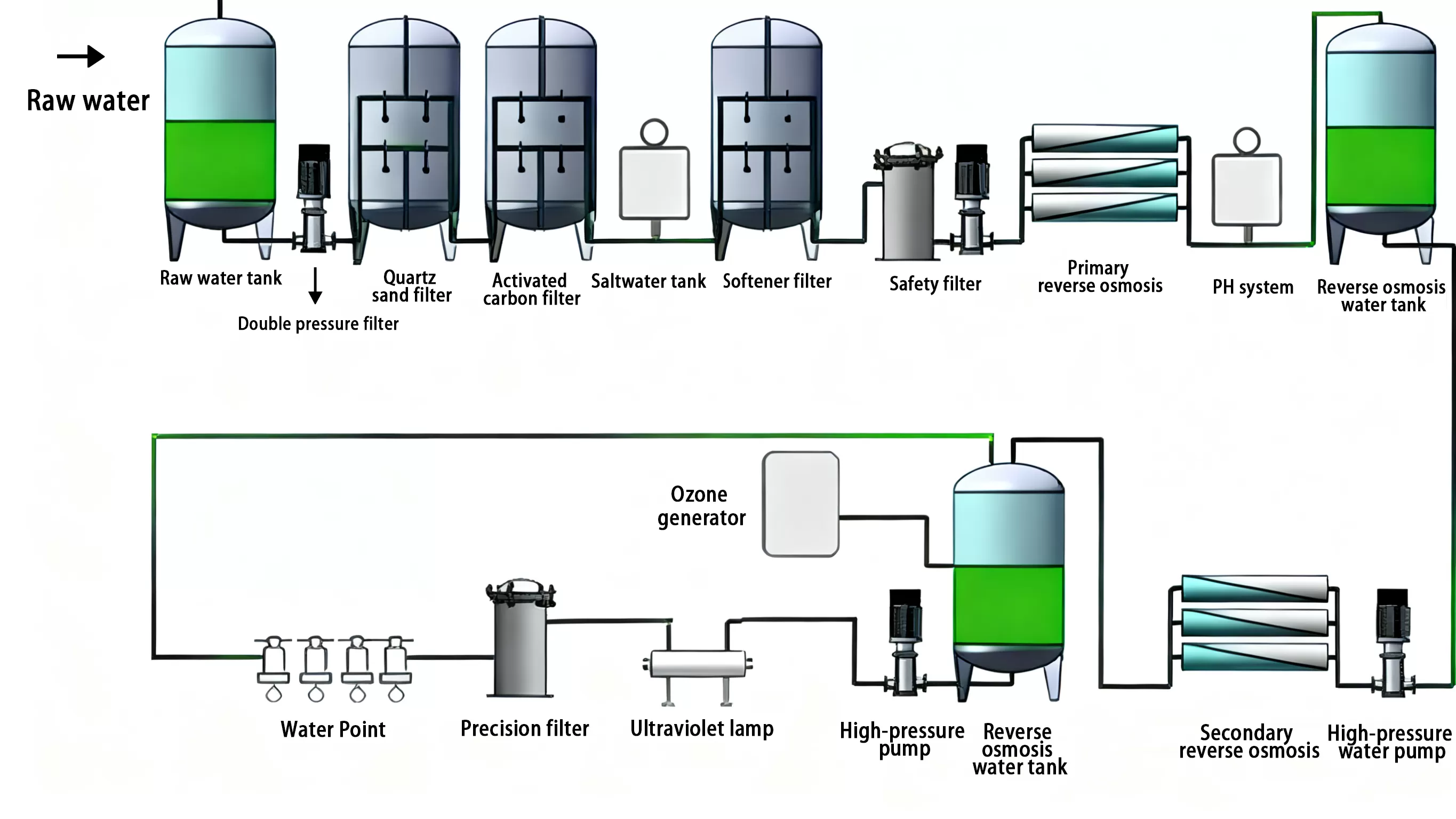 Pre treatment of incoming water: Filter out large-particle impurities and residual chlorine to ensure that the incoming water is compatible with the membrane components;